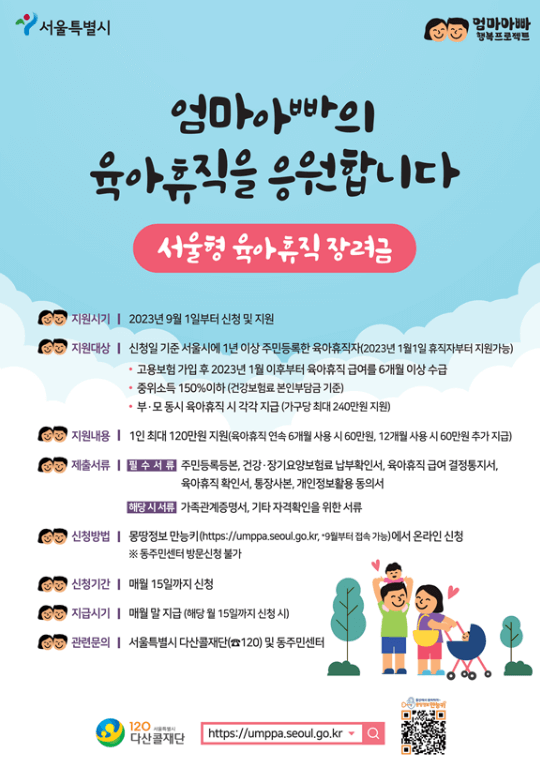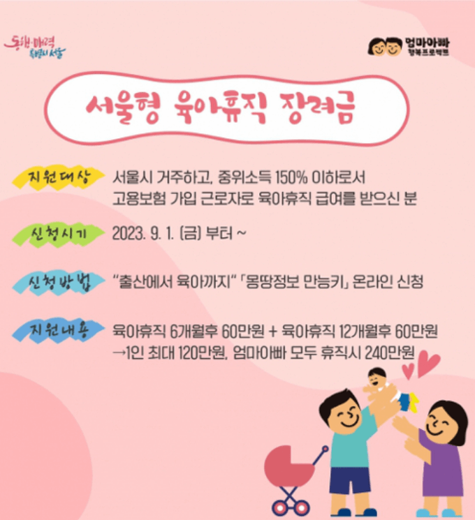 서울시는 엄마아빠 행복 프로젝트의 일환으로 9월 1일 부터 육아 휴직한 직장인 엄마아빠를 위해 '서울형 육아휴직 장려금' 신청 및 접수를 시작합니다.