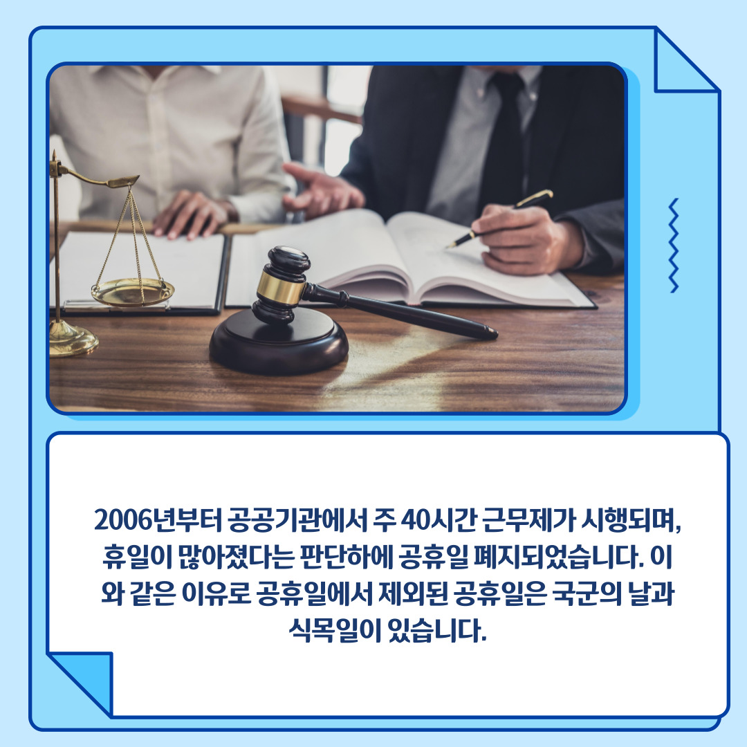 휴일 과다 문제: 2006년부터 공공기관에서 주 40시간 근무제가 시행되며, 휴일이 많아졌다는 판단하에 공휴일 폐지되었습니다. 이와 같은 이유로 공휴일에서 제외된 공휴일은 국군의 날과 식목일이 있습니다.