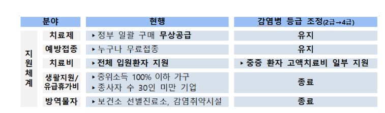 고위험군 집중 보호를 위해 치료제, 예방접종 무상 지원체계는 이전과 동일하며, 겨울철 유행까지 충분히 대비할 수 있도록 무상공급을 유지합니다, 허나 치료비와 생활지원/ 유급휴가비/ 방역물자는 종료됩니다.
