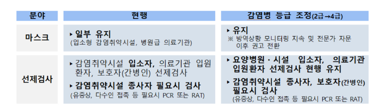 감염 시 건강 피해가 큰 의료기관, 요양병원 등의 선제 검사는 현행대로 유지됩니다. 또한 의료기관 입원 전 환자 및 상주 보호자, 감염취약시설 조사자들을 위해 필요시 검사받을 수 있도록 보건소 선별진료소는 전과 동일하게 무료 검사 지원이 계속됩니다.