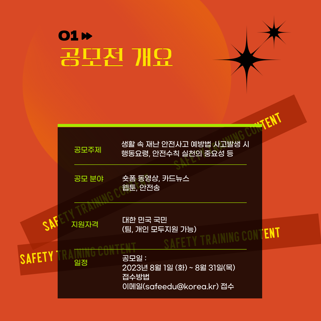 안전교육 콘텐츠 공모는 재난 및 안전사고 발생 시 국민 스스로 대응 역량 강화를 위한 수요자 중심의 안전교육 콘텐츠 제작 보급을 위하여 추진됩니다.